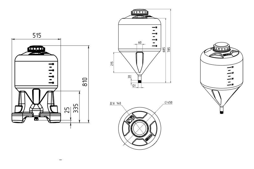 Имеется возможность установки отводов и кранов 1" на конусной части емкости благодаря наличию плоских площадок у ЦКТ.